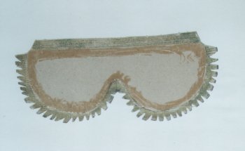 Podklad dvakrát překreslíme na černou koženku z toho jednou přesně a jednou s asi centimetrovým okrajem. Okraj rozstříháme na trojůhelníčky aby šel dobře přehnout přes podklad. Jakmile máme vytvořeny obě koženové strany masky natřeme podklad a koženku s přesahem chemoprenem a necháme lepidlo 15min oschnout. Potom opatrně nalepíme koženku na kartonový podklad a přesahující trojůhelníčky přehneme a přilepíme tak, jak je patrné z obrázku.