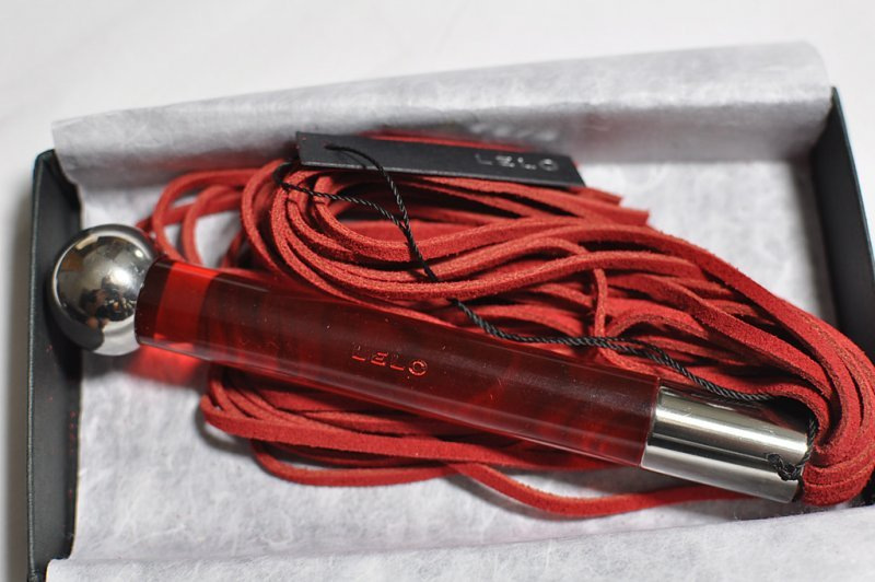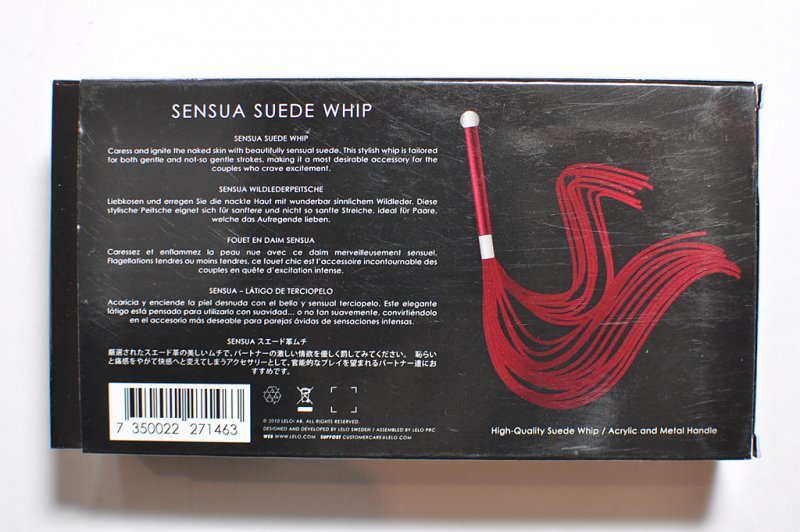 Důtky Lelo Sensua lze pořídit v černé, fialové nebo červené barvě. Kůže je pravá a jemná. V tenkých proužcích vychází z rukojeti vyrobené z probarveného skla a chromového kovu.